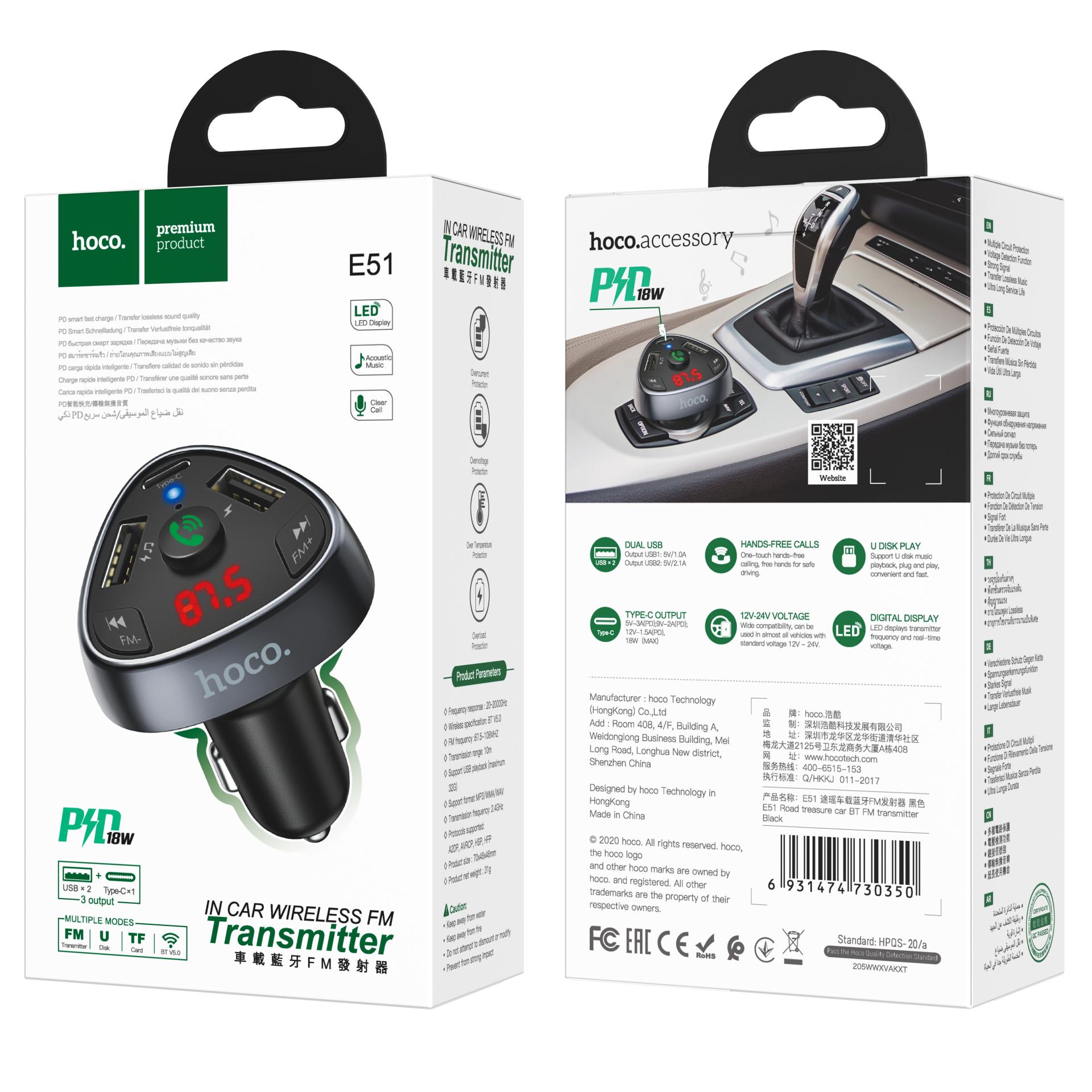֎Sạc xe hơi hoco E51 (2 USB, 1 Type-C 3.1A, FM/Bluetooth)